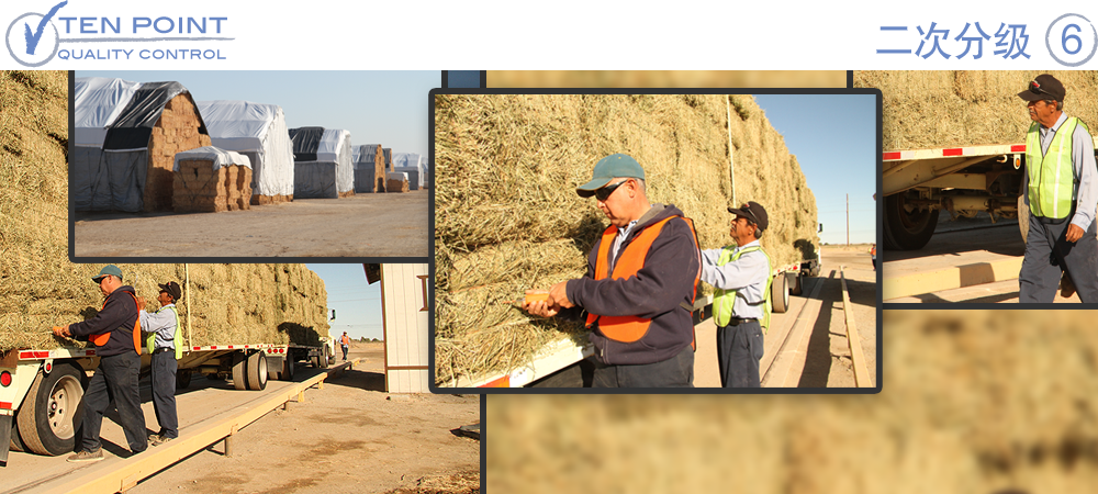 各草堆运抵我们的堆场后,我们的“十点质量控制经理”及其团队会展开二次分级。随后,将对比质量控制经理报告与现场分级报告,以确保我们的分级准确、一致。质量控制经理之后将监督草料称重过程,并实施第四次水分分析。最后,我们的“十点质量控制经理”会通知您产品已根据您的要求进行了精确储存。